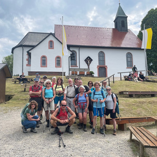 In noch angenehm kühler Luft ging es am Morgen zunächst für zwei Stunden von Elzach auf dem Yacher Höhenweg stetig bergauf bis zum Tafelbühl, einem Gleitschirm-Startplatz mit Sitzbänken und ersten weitreichenden Aussichten. Danach folgte der abwechslungsreiche und weniger anstrengende aber ebenso aussichtsreiche Kammweg zum Hörnleberg. Genau an diesem Sonntag war dort „großer Wallfahrtstag“, der „Dreifaltigkeitstag“ – uns kam das sehr gelegen, hatte doch deshalb der Kiosk geöffnet und bot willkommene Erfrischung. Der Rückweg verlief zunächst auf dem Stationenweg hinunter Richtung Simonswald und dann, immer am Hang entlang, mit zahlreichen kleinen Schleifen in die Seitentäler hinein, auf wenig bekannten Wegen bis vor nach Bleibach und mit dem Bus zurück nach Elzach.