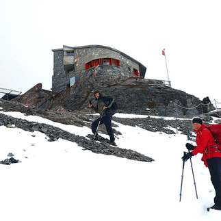 so dass die Tour in vollem Umfang durchgeführt wurde. Beim Aufstieg zur unterhalb des Tödi gelegenen Fridolinshütte blieb es trocken. Auch die Wanderer, die den lange Aufstieg gewählt hatten, kamen gut an. Die tolle Lage, eingerahmt von Felswänden und Gletschern, verbunden mit einem herrlichen Sonnenuntergang, entschädigte für die Mühen des ersten Tages. Nach einem stimmungsvollen Hüttenabend stand am zweiten Tag der Übergang zur Planurahütte auf dem Programm. Auf aussichtreichem Pfad wurde Obersand erreicht. Bevor nun der steile Anstieg zur fast dreitausend Meter hoch gelegenen Hütte angegangen wurde, war natürlich eine Rast mit Stärkung angesagt. Dies war auch nötig, das letzte Teilstück zur Hütte wurde von heftigen Graupelschauern und eisigen Windböen begleitet. Es war an diesem Tag in der Schweiz Nationalfeiertag und wir wurden noch vor dem Abendessen mit Schweizer Spezialitäten verwöhnt. (Gratis!) Über Nacht gab es weitere Niederschläge in Form von Graupel und Schnee. Bereits um 7 Uhr verließ man die Hütte um den heiklen Abstieg anzugehen. Bald setzte starker Schneefall ein und die Wegfindung war nicht einfach. Nach knapp 2 Stunden hatte man dann das Schlimmste hinter sich. Dank vorbildlicher Disziplin, Konzentration und Rücksichtnahme aller Teilnehmer wurde diese anspruchsvolle Wegstrecke mit Bravour gemeistert. Der Gegenanstieg von Obersand zur Beggilücke forderte nochmals die letzten Reserven, bevor man - von ständigen Regenschauern begleitet – die Claridenhütte erreichte. Die Hütte war voll belegt und der große Trockenraum war am Abend übervoll mit nassen Klamotten, chaotisch und sehenswert!